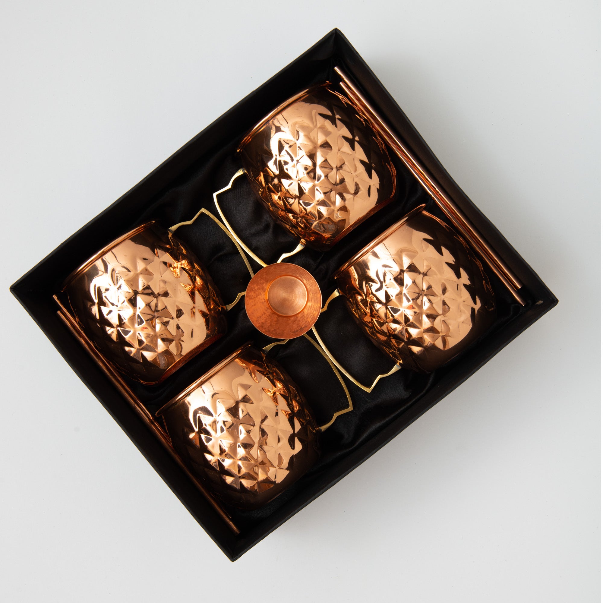 - Set of 4 Moscow Mule Mugs, includes copper shot glass and copper straws